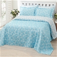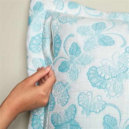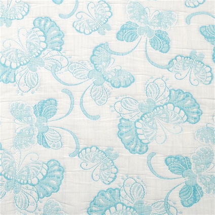 White butterfly print on light blue background one side and negative white print on white background on other side of bedspread.