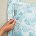 Pillowcases have white print on blue with negative reverse blue on white fabric, invisible zipper closure at short end - pillowcases have straight edges