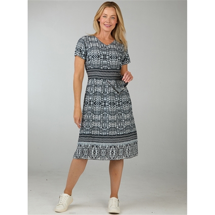 Short sleeve empire line dress. Elasticised back. 100% Viscose.
