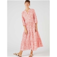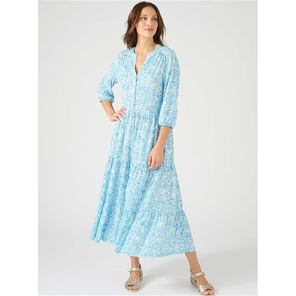 Featuring a pretty all over print, this dress flatters with a tiered skirt. A round neckline with a small V and short button placket. 3/4 length sleeves and in a slight A-line shape. 92% Polyester, 8% Elastane.
