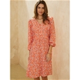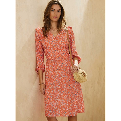 A stylish and flattering lightweight dress. Featuring an all over print, this dress has a V-neckline and elastic cuffs on the long sleeves. Adorned with pleats on the front with a short button placket and ruffle details on the shoulders. 100% Viscose.