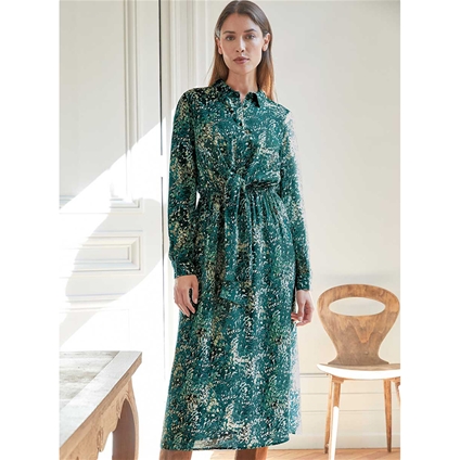 In a flattering silhouette, this dress features a beautiful all over print. A shirt collar and short button placket. A tie waist for shape and button cuffs on the ends of the long sleeves. 100% Viscose.