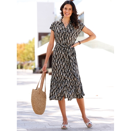 Wonderfully light summer dress with a trendy leaf print in harmonious natural colours. With a shirt collar and open V-neckline. Dropped shoulders and full-length button placket. Slight gathering at the waist seam. Narrow belt loops, with a wide, detachable tie belt. Cuts a beautiful figure even without a belt. Skirt section in a beautifully swinging A-shape with flounce at the hem. 100% Viscose.