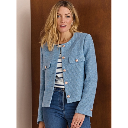 Textured collarless tweed jacket with faux pockets and soft gold buttons, feminine and casual. 80% Polyester, 20% Wool.