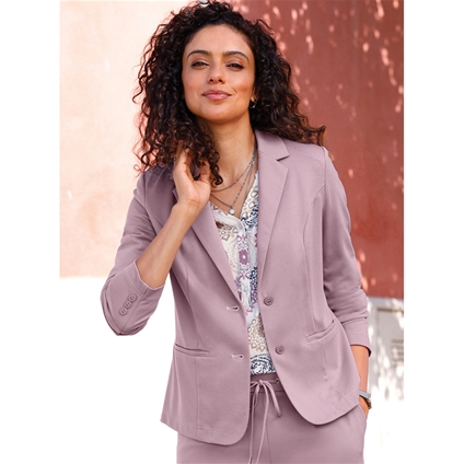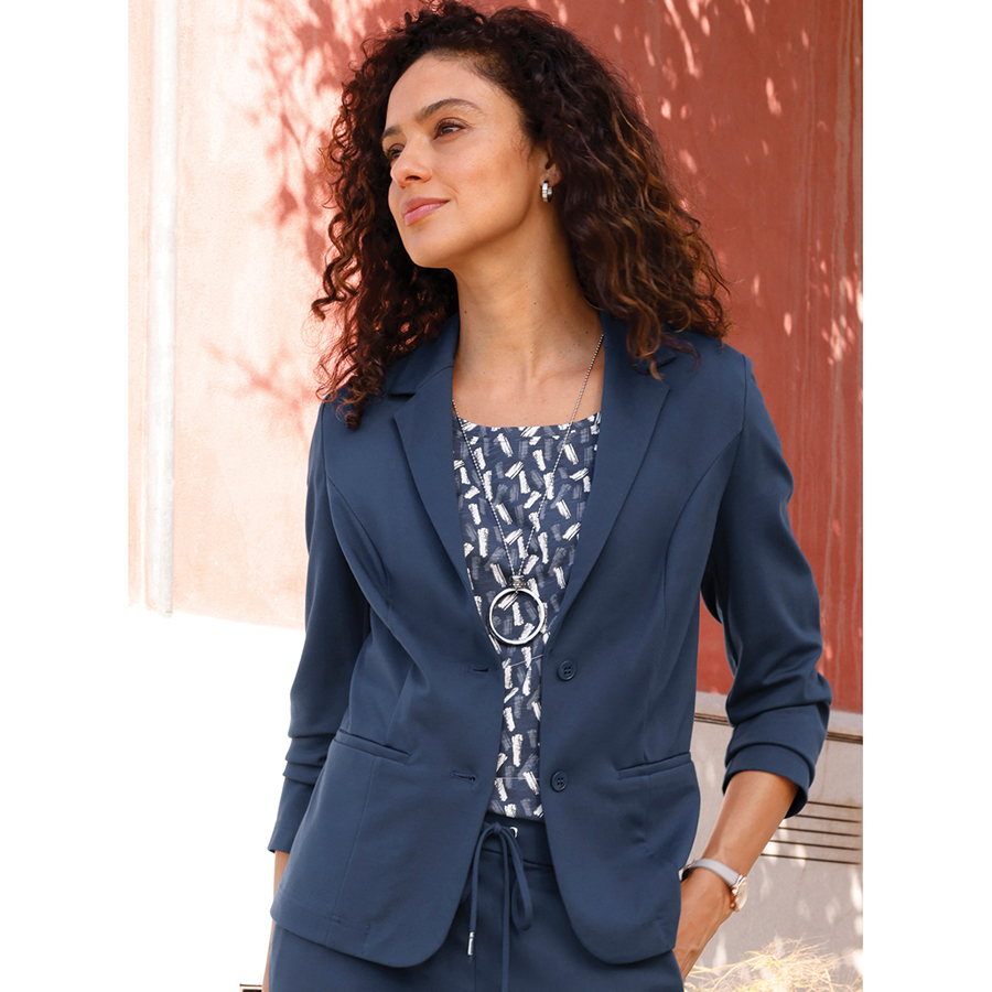 This jersey blazer features a classic shape with a lapel collar, button front, 2 welt pockets, rounded edges at the front and decorative buttons at the end of the long sleeves. Shoulder pads and Viennese seams for a perfect fit. The soft and easy-care fabric makes it comfortable and suitable for everyday wear. 58% Viscose, 36% Polyamide, 6% Elastane.