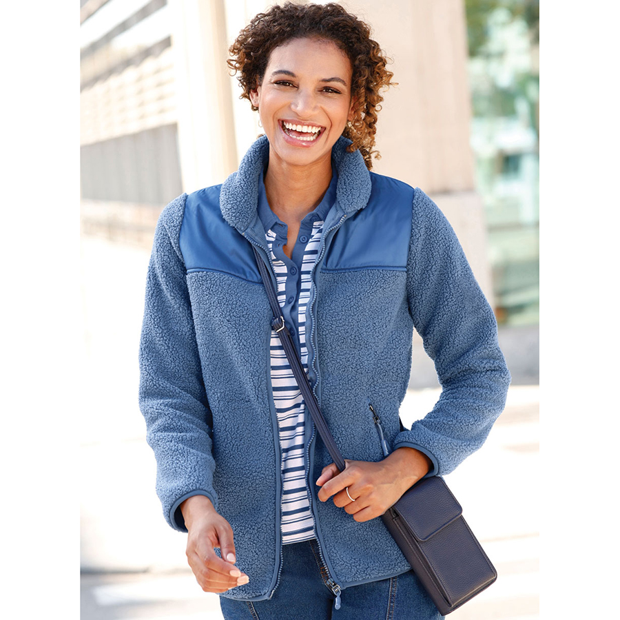 Fleece jacket in a trendy material mix of cozy teddy fleece and woven sections. Protective stand-up collar also with teddy fleece inside. 2 practical zipped pockets. Elastic piping along the zipper and at the cuffs. 100% Polyester.