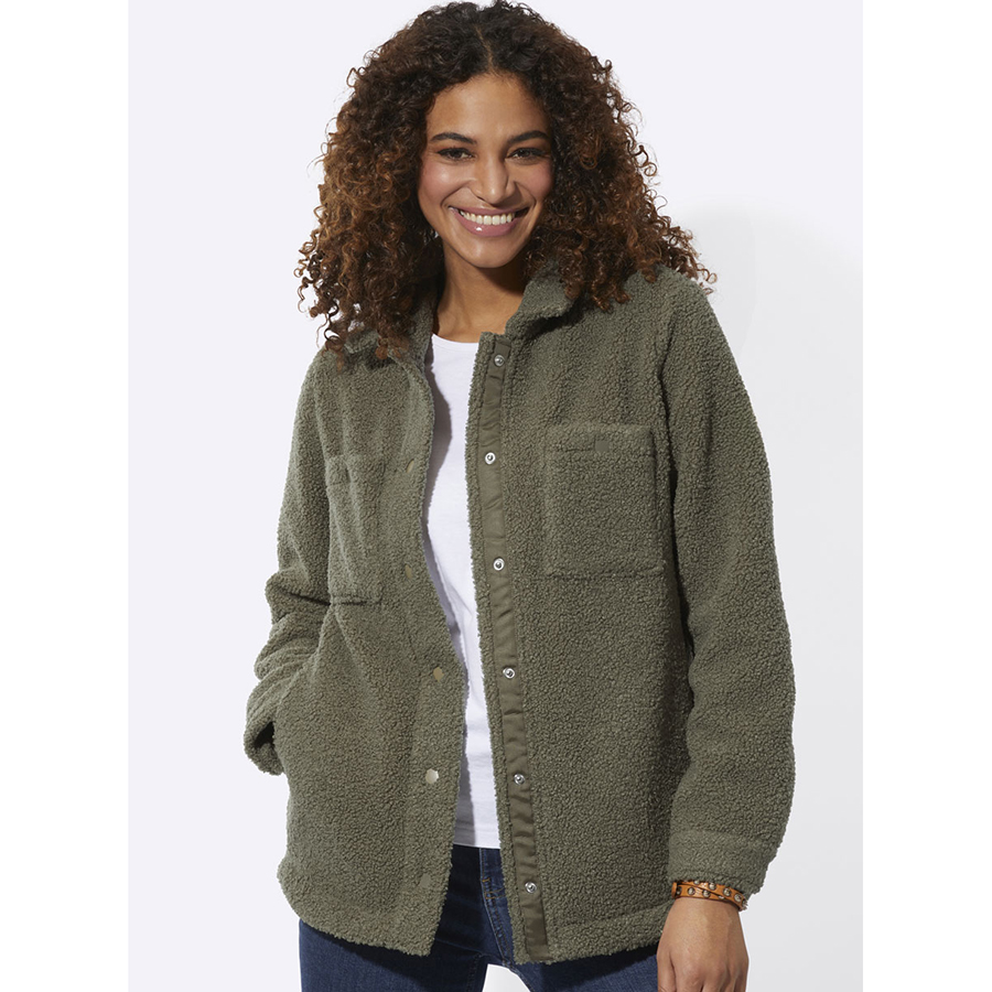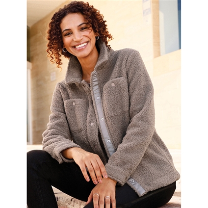 Fluffy, soft teddy fleece jacket for the season! With turn-down collar and press stud placket. 2 breast pockets with press studs and 2 in seam pockets. Long sleeves with cuffs and press stud. Rounded hem at the front and back.