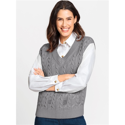 A sweater vest in a soft cotton mix. With a combination of cable and ajour patterns at the front and a plain back. Rib knit on the V-neck and the wide hem with additional integrated elastic. 50% Cotton, 50% Acrylic.