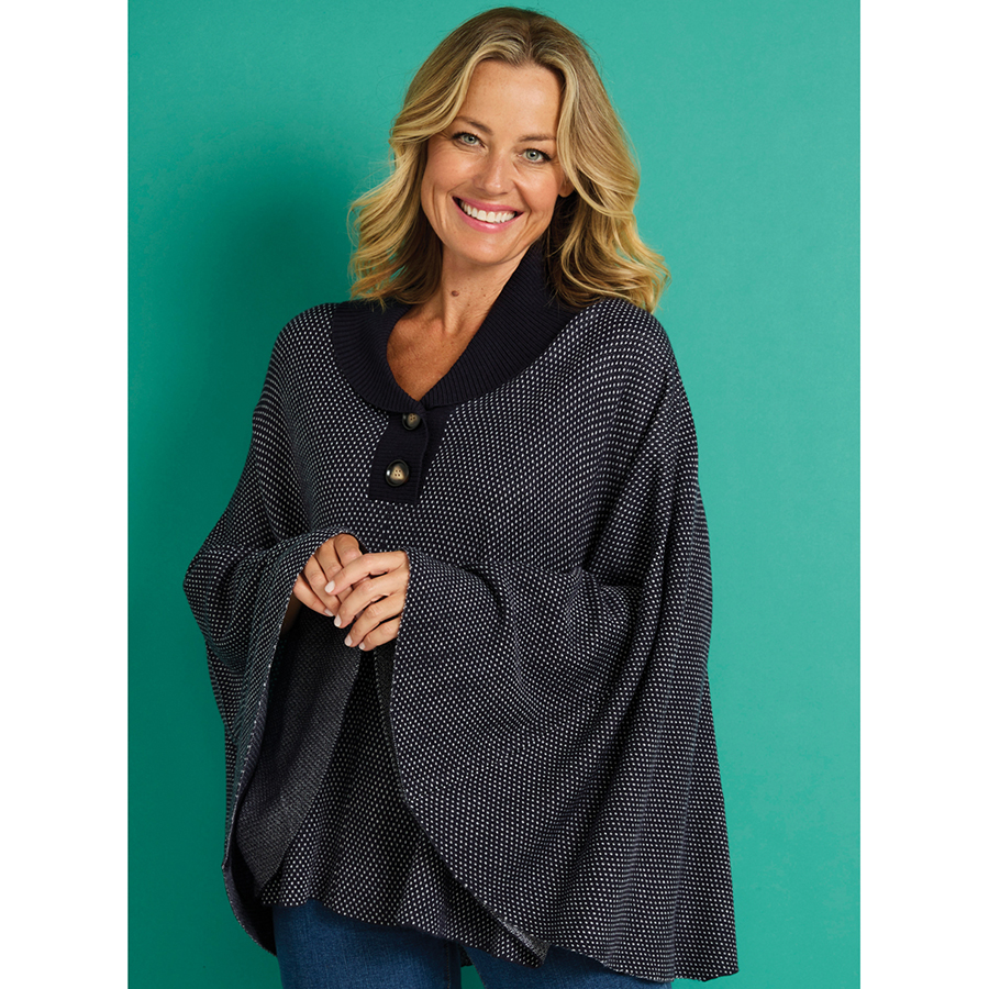 Keep cosy and comfortable with this spotty knit poncho. In a pull on style, this knitted poncho has a roll collar and a two button neck tab. Perfect for any casual activity! 100% Acrylic.