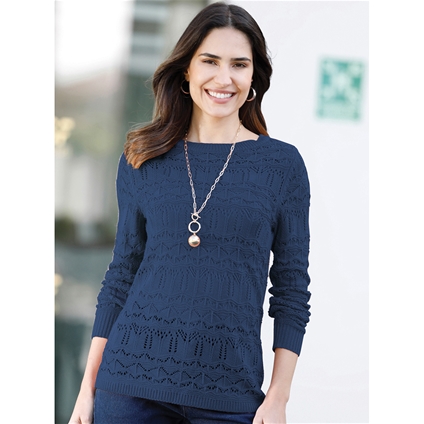 In an elegant lacey knit, this sweater is elaborately knitted into shape. With a subtle boat neckline and ribbed cuffs on the long sleeves and hem. 100% Acrylic.