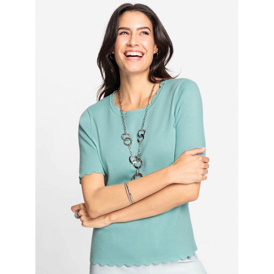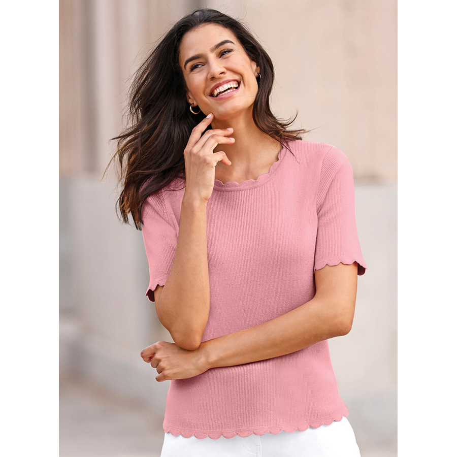So soft and supple that you won’t want to take it off! Sweater in a fine ribbed look with scalloped edging on the round neckline, short sleeves and hem. 100% Cotton.