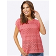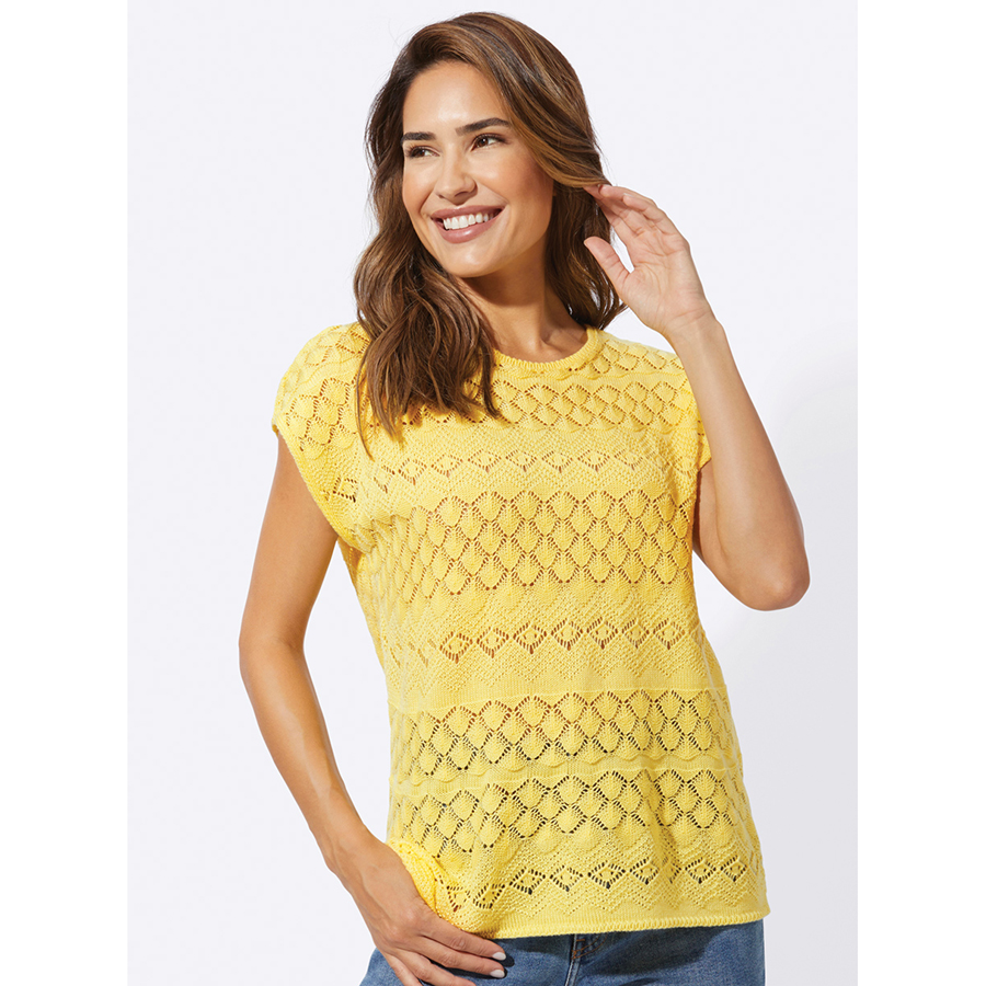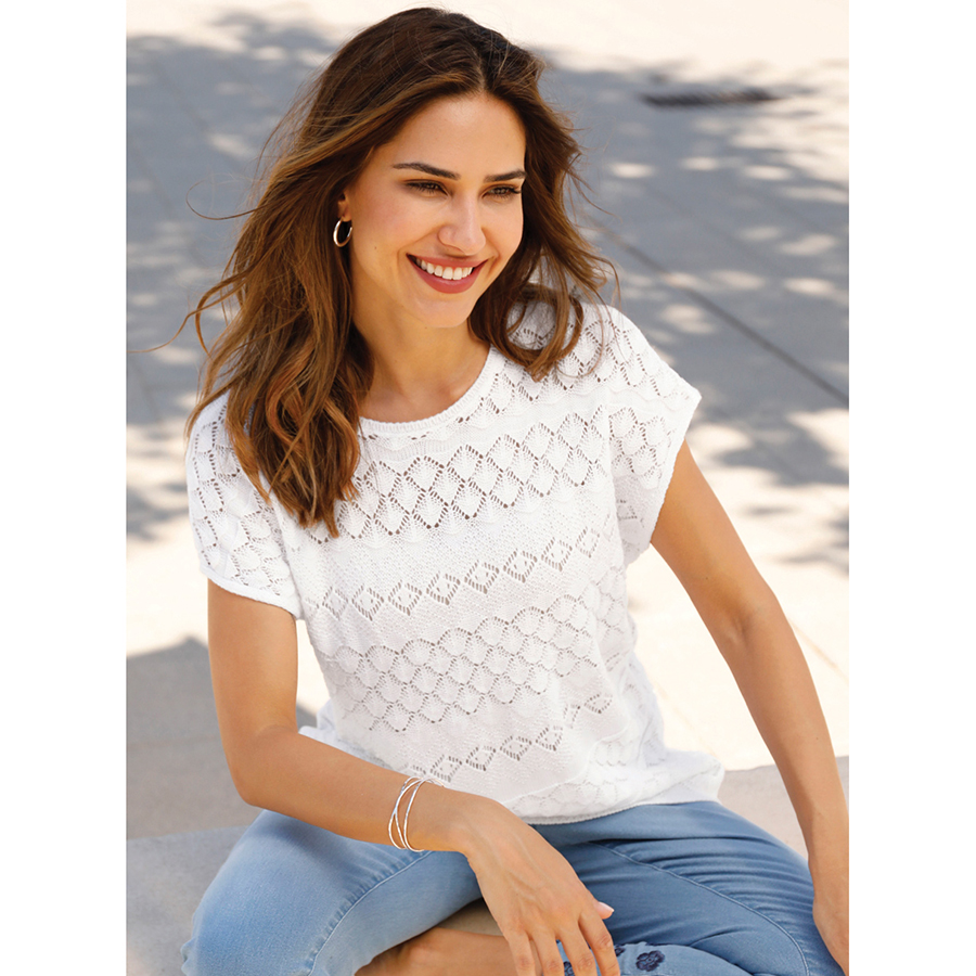 Easy-care ajour sweater in an airy all-over knit pattern. With a round neckline and fashionable dropped shoulders. Ribbed cuffs on the short sleeves and hem. 100% Acrylic.