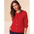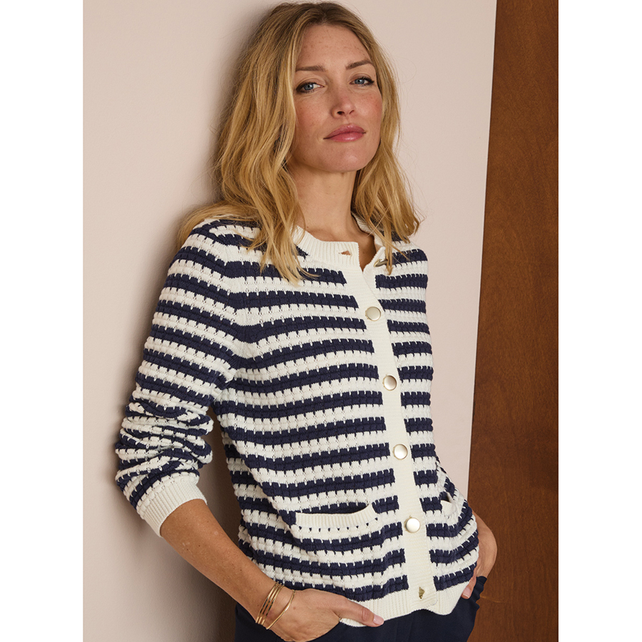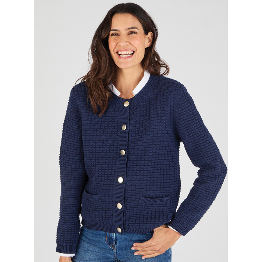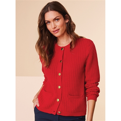 Cotton textured cardigan with front pockets and metal buttons. 100% Cotton.