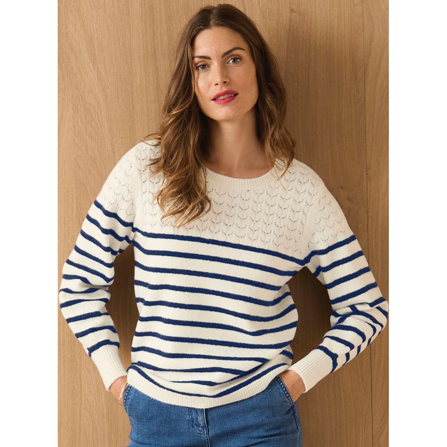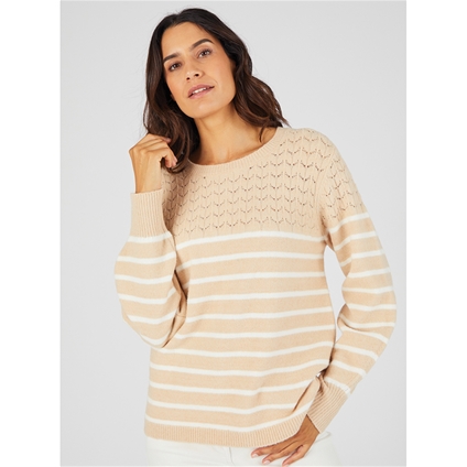 Soft touch yarn sweater with a feminine pointelle detail. Stripes give it a casual feeling. 69% Polyester, 20% Acrylic, 8% Wool, 3% Elastane.