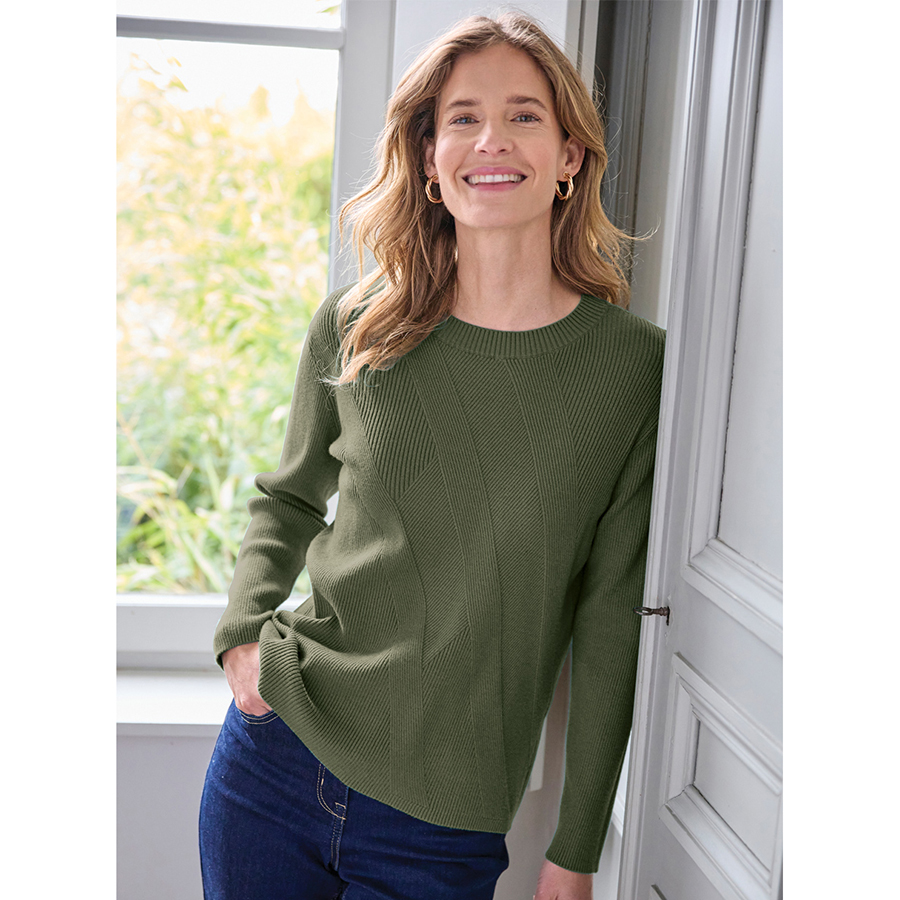 A timeless knit with a set of elongating diagonal rib stripes. An ideal sweater to wear under a jacket with jeans, pants or skirt. Round neck. Length approximately 62cm. 50% Viscose, 30% Polyester, 20% Polyamide.
