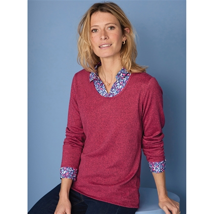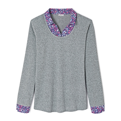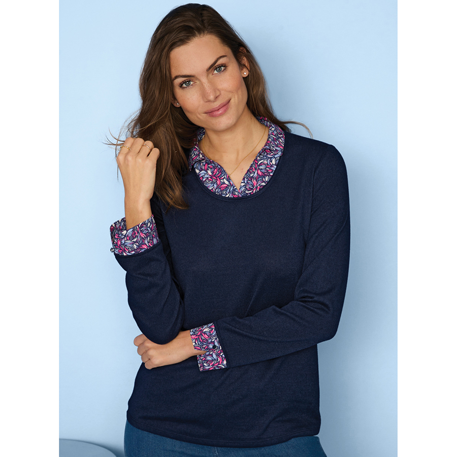 Easy to wear 2 in 1 polo sweater, with woven printed collar and cuffs. Wear it with denim or dress it up with your favourite tailored pant. 95% Polyester, 5% Elastane.