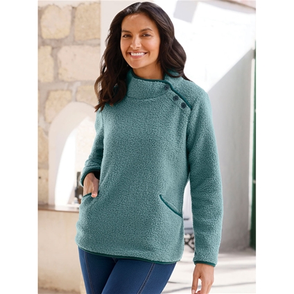 Cosy, soft fleece sweater with decorative buttons on the overlapping stand-up collar. Long sleeves and slightly rounded pockets. The elasticated contrast piping adds a sporty accent.