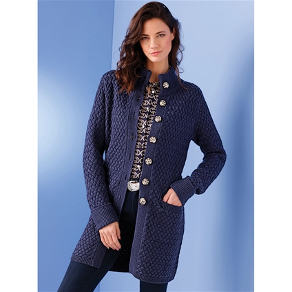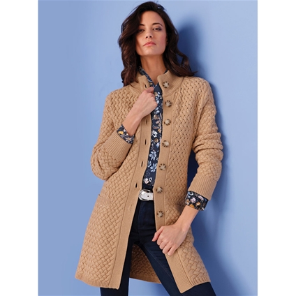 Cardigan with a striking cable-knit pattern. Ribbed button placket with horn-look buttons. Cleverly placed pockets. Particularly dimensionally stable ribbed trims. 75% Acrylic, 15% Wool, 10% Polyamide.