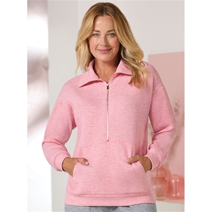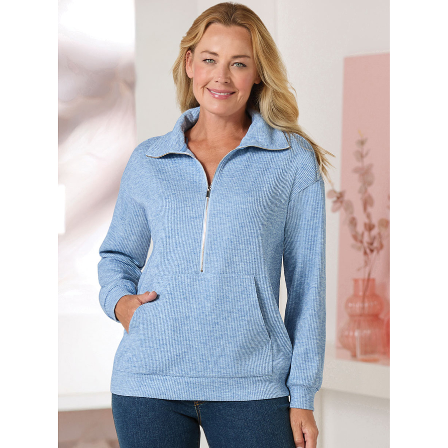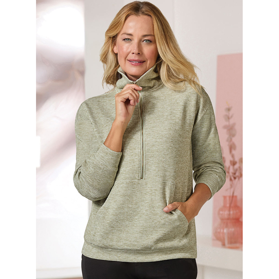 Soft fluffy knit zip sweatshirt with high neck and handy kangaroo pocket.