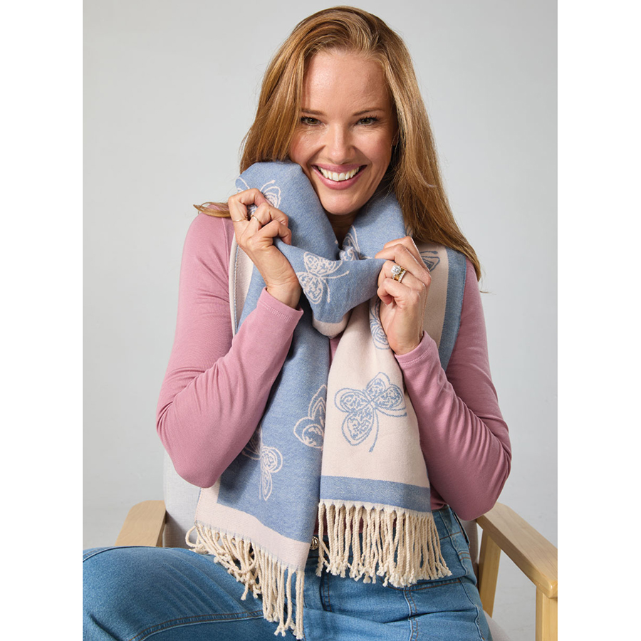 Reversible pashmina with soft fringe detailing, a delicate, elegant finish.