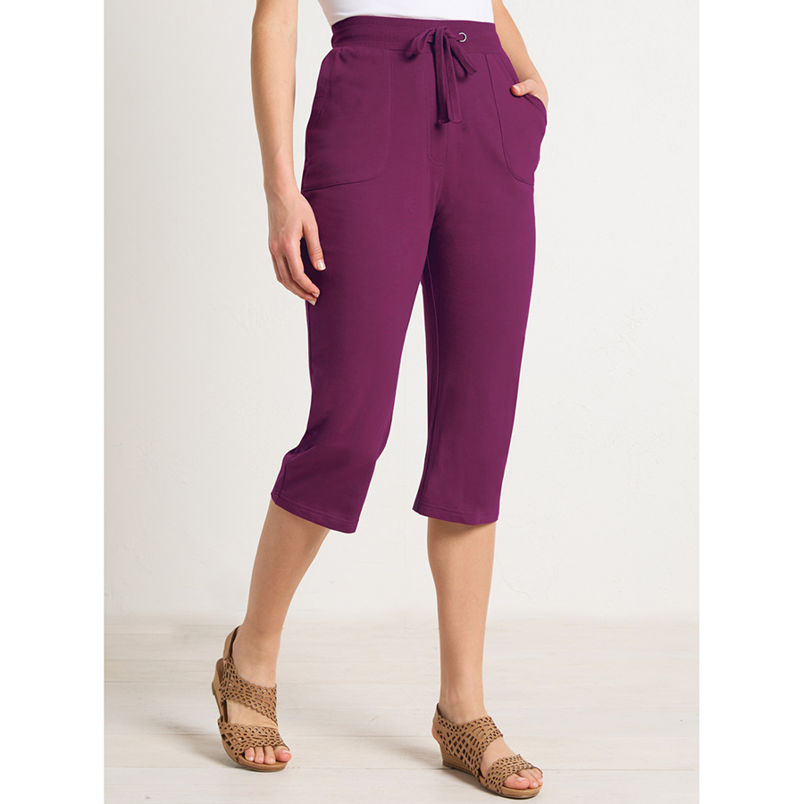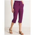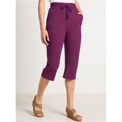 Crop length casual pants with side pockets. Rib elastic waist with drawstring and rivets. 100% Cotton