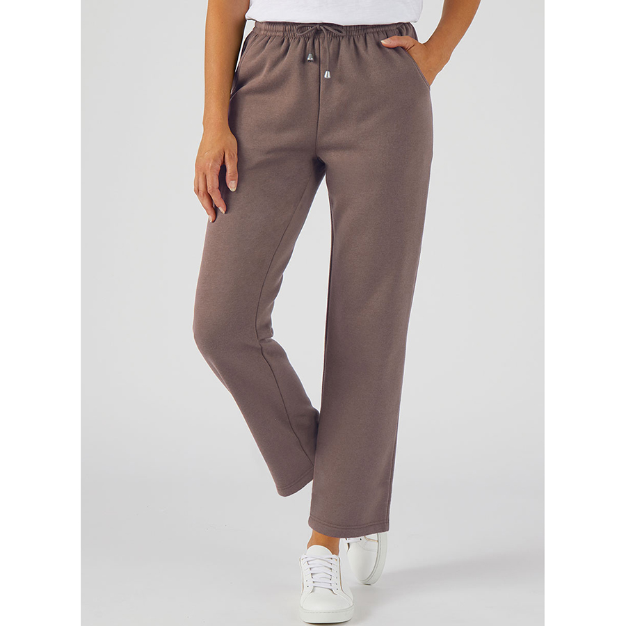 Full length pull-on pants with full elastic waist and waist tie with toggles. Side pockets. 65% Polyester, 35% Cotton.
