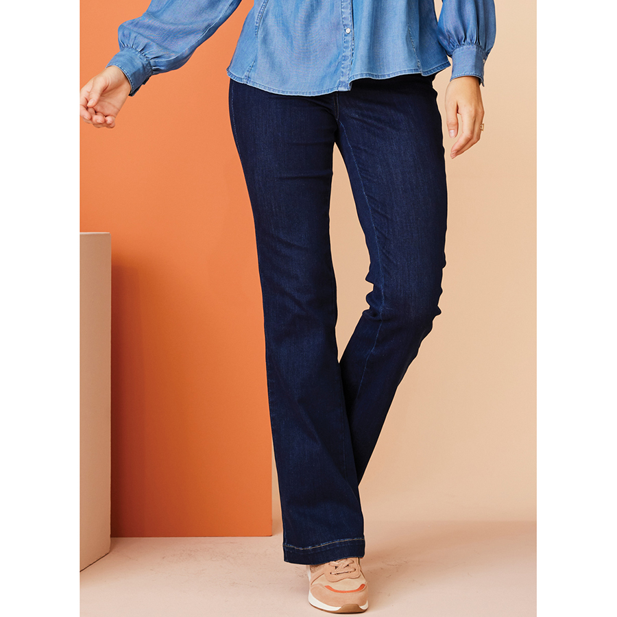 Keep it casual and stylish with these Perfect Fit Bootcut Jeans. With an elastic waist at the back and classic button fly front these jeans are super comfortable to wear! Classic five pocket jean styling. 107cm-111cm length. Faded Denim: 65% Cotton, 33% Polyester, 2% Elastane. Indigo: 96% Cotton, 4% Elastane.