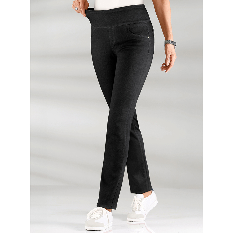 Pants with a high, all-round stretch waistband: not only are they wonderfully comfortable, they also cleverly conceal any tummy bulges! With a faux zipper fly, 2 imitation pockets at the front and 2 back patch pockets. Length: 103cm-107cm. 76% Cotton, 22% Polyester, 2% Elastane.
