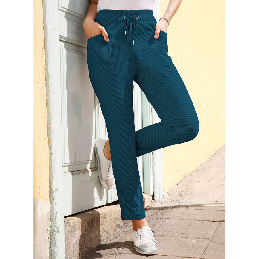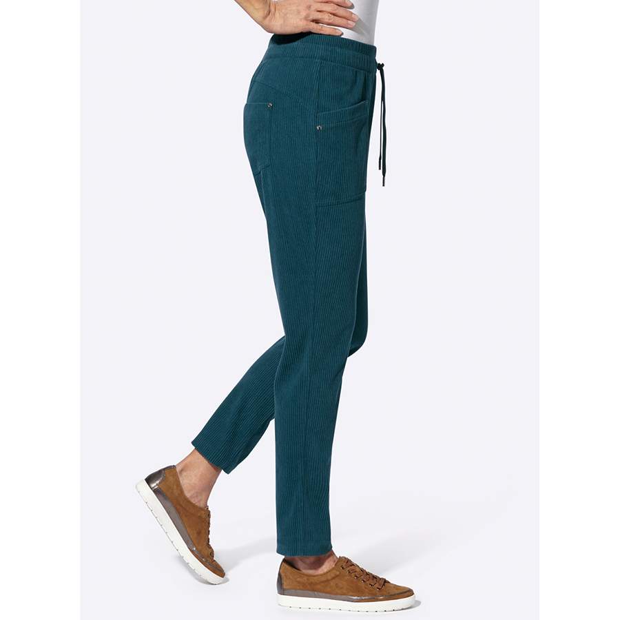 Slip them on and off you go: super soft fine corduroy trousers with an all-round stretch waistband, drawstring and tie. Imitation zipper at the front. Two large, slightly slanted pockets at the front, each with a rivet and two patch back pockets with rivet decoration. Length: 100cm-104cm. 100% Polyester.