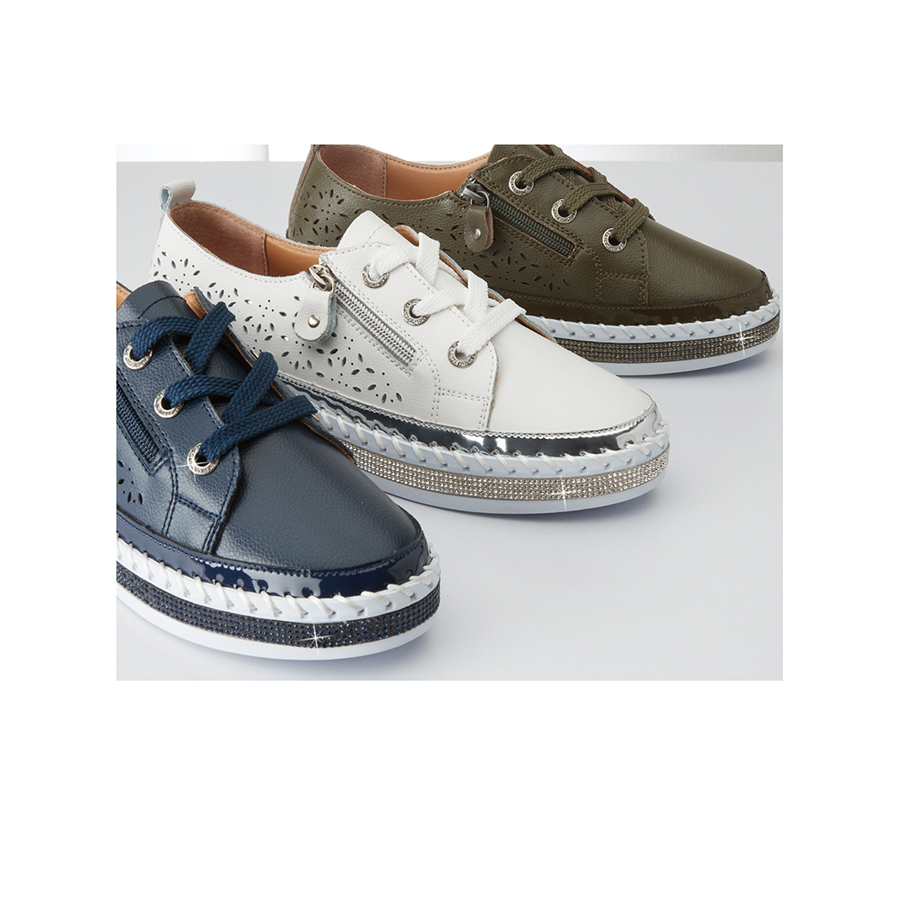 Add sparkle to your day with these stylish trainers featuring a lace-up and side zip design. Crafted from soft leather uppers with lasercut perforations and glittery eyelets, they’re set on a low platform heel lined with diamantes. Perfect for comfort and style, they suit city outings or special events.