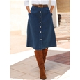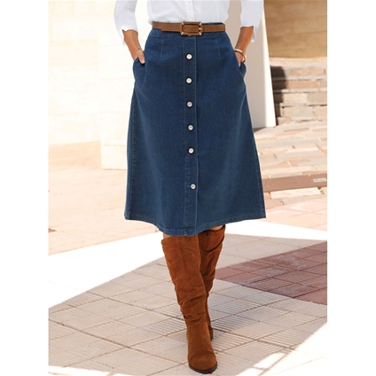 Jeans skirt in a flattering A-line shape with waist darts for a great fit. Imitation button placket and walking slit at the front, zip and dividing seam at the back. 2 pockets. Belt not included. Length: 76cm-78cm. 79% Cotton, 19% Polyester, 2% Elastane.