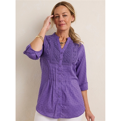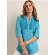 Decorated with pintucks and embroidery, this is summer's must-have style. Tunic has notch neck, roll back sleeves, button front and comes in a cool dobby fabric. 100% Cotton.