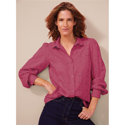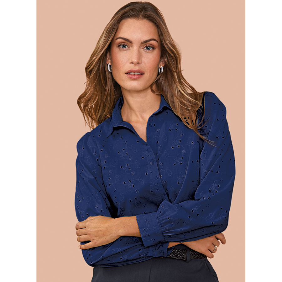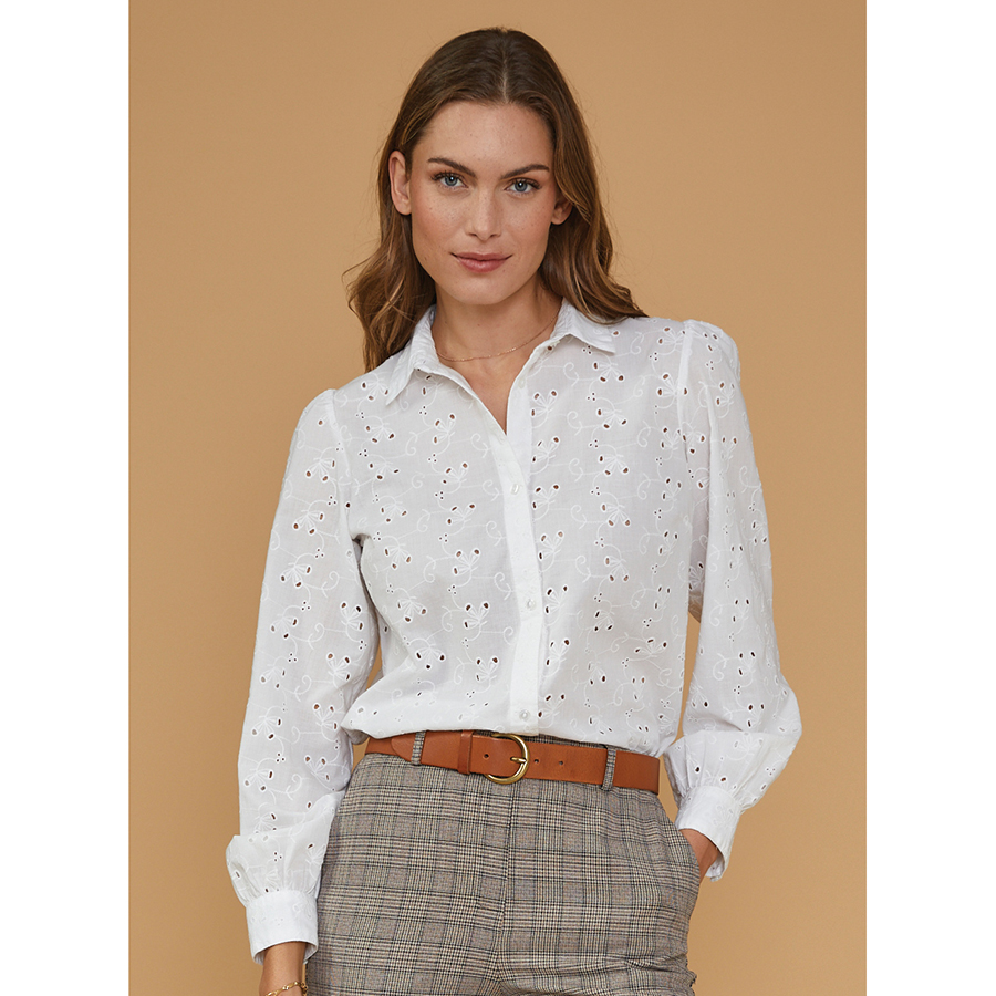 A soft and light blouse with a stylish broderie design. This top is perfect to dress up or down depending on your occasion. A shirt collar, front button placket and long sleeves with classic button cuffs. 100% Cotton.