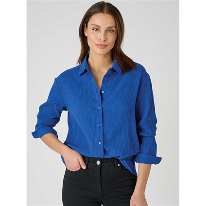 This ladies blouse has long sleeves with tab-back button fastening so you can wear the sleeves elbow length too. Pure cotton for cool comfort. 100% Cotton.