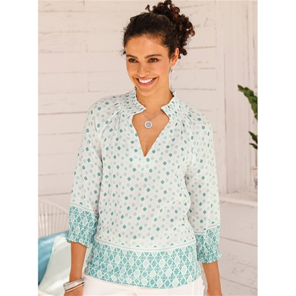 Stay stylish with this pretty printed tunic. In flowing viscose, this top has a high round neckline with gathers and a V. ¾ length sleeves with elastic cuffs. 100% Viscose.