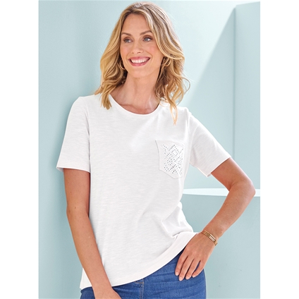 Casual feminine cotton tee, in bright tones or white with a broderie pocket detail, making your back to denim outfit a touch prettier. 100% Cotton.
