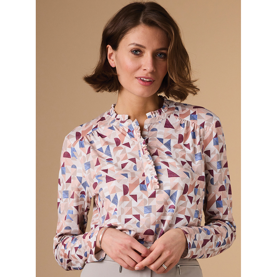 Soft jersey knit top with baby ruffle trim giving this top a feminine look and feel. 92% Polyester, 8% Elastane.