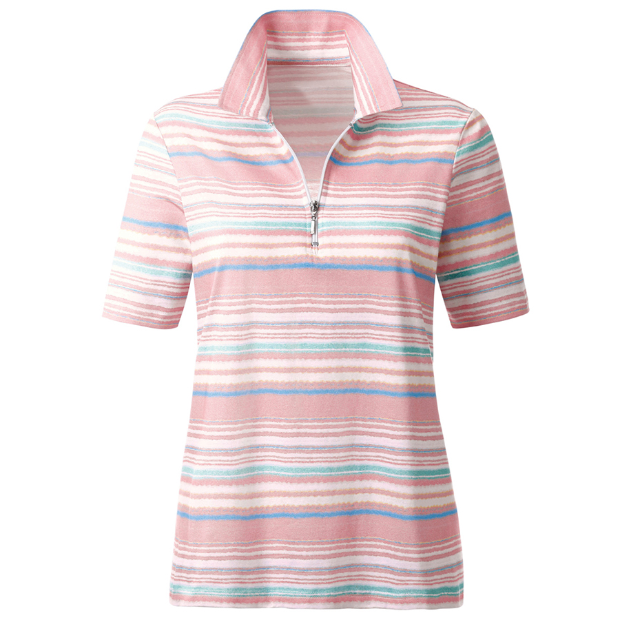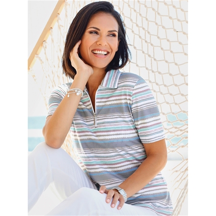 Coordinating striped design in delicate pastel shades: polo shirt with a short zipper at the front. 50% Cotton, 50% Modal.