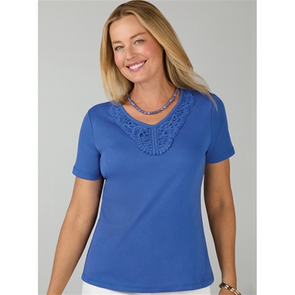 Lovely feminine short sleeve tee with subtle V-neckline adorned with a flattering shaped lace. Main: 65% Polyester, 35% Cotton. Lace: 100% Polyester.
