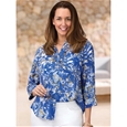 In a breathable linen blend this button front shirt is made for summer. With collar, front patch pocket, and ¾ sleeves. 70% Viscose, 30% Linen.