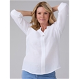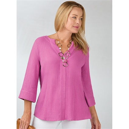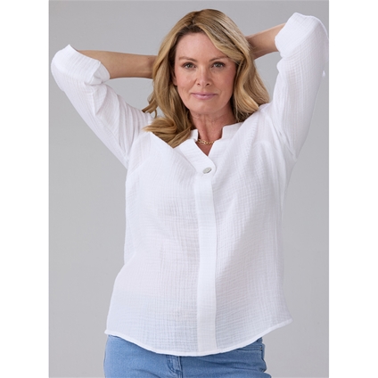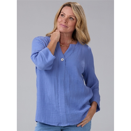 Lightweight cotton top featuring ¾ length sleeves, a single-button V-neckline, and a crinkled texture detail. 100% Cotton.