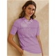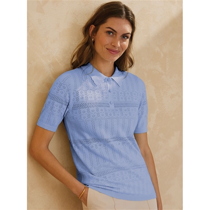 A casual and sporty polo in a pretty pointelle knit. This top has a short button placket and polo collar. Short sleeves and made in a cotton mix for comfortable all day wear. Featuring a lovely pointelle knit for design. 83% Cotton, 17% Nylon.