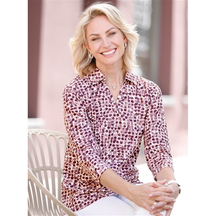 Polo shirt – the graphic pattern can be combined in many different ways! Open polo collar, 3/4 sleeves. Comfortable cotton quality. 100% Cotton.