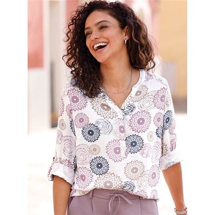 Pleasantly lightweight long-sleeved blouse in an attractive, ornamental print design. Casual slip-on style with a round neckline, small V and short button placket. Wide pleat on the back yoke. The sleeves with button cuffs can be rolled up and fastened with a tab and button. Slightly rounded hem. 100% Viscose.