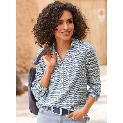 Print blouse in a two-tone design and soft, supple fabric. In a slip-on style with an open shirt collar and short button placket. Wide pleat at the back yoke. Narrow button cuff at the end of the long sleeves. Slightly rounded hem. 100% Viscose.