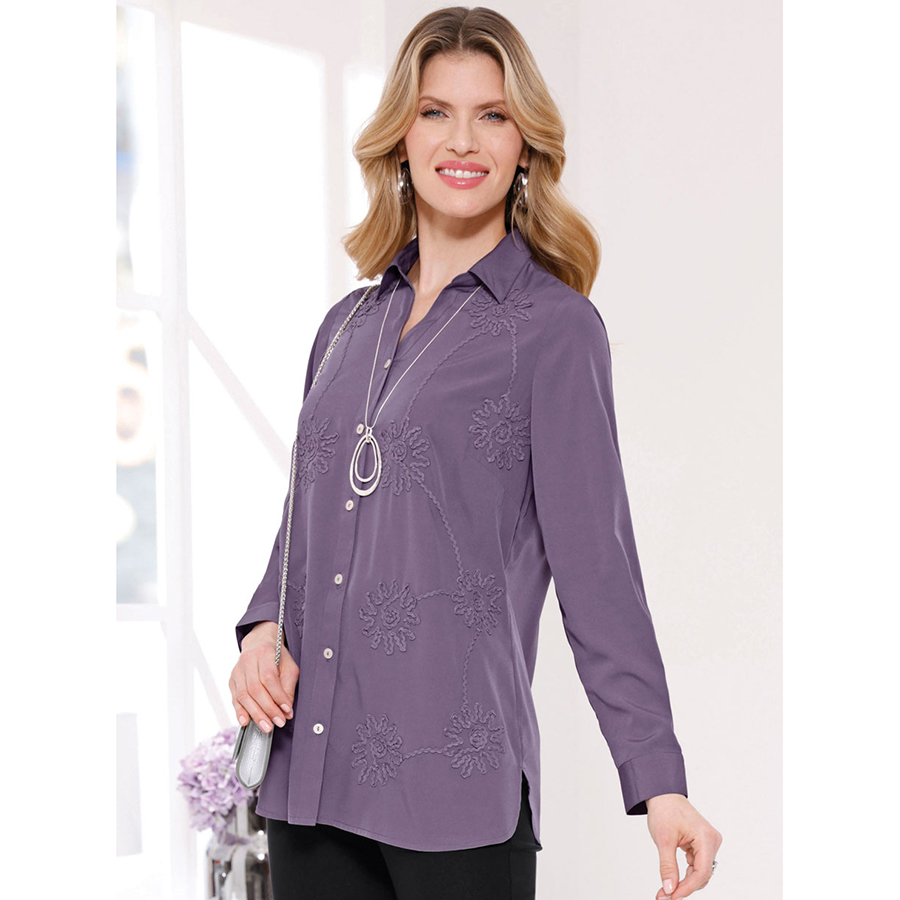 This chic long blouse in flowing fabric with decorative floral embroidery at the front, an open shirt collar, full-length button placket and long sleeves with button cuffs. Shaping bust darts. Side slits ensure plenty of freedom of movement. 100% Polyester.