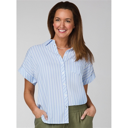 Relaxed and effortlessly chic, this 100% viscose shirt features extended sleeves and a timeless blue stripe design — perfect for laid-back days or smart casual style. 100% Viscose.