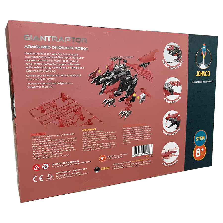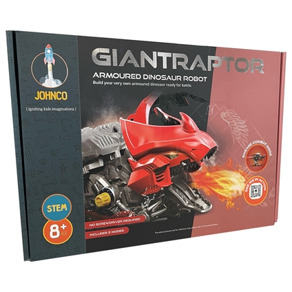 Unleash epic fun with the Armoured Giantraptor! Build, play and battle – no tools needed. Perfect for ages 8+, it boosts creativity, motor skills and dino-sized imagination! Dimensions: 33W x 23H x 9D cm.