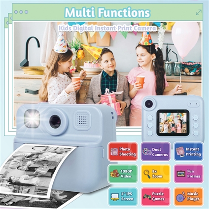 Capture colour and creativity with this fun, feature-packed kids' instant print camera. With dual lenses, HD video, 48MP photos and instant printing, kids can shoot, print and play. Includes filters, frames, games, music and a 32GB micro SD card. It's the perfect all-in-one creative gadget – ready to use straight from the box! Dimensions: 10.1 x 5.8 x 8.7 cm. Includes built-in rechargeable battery.