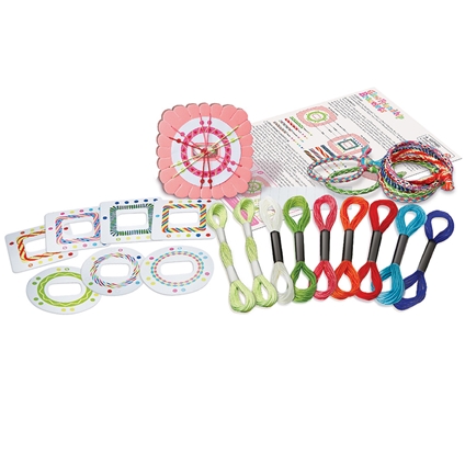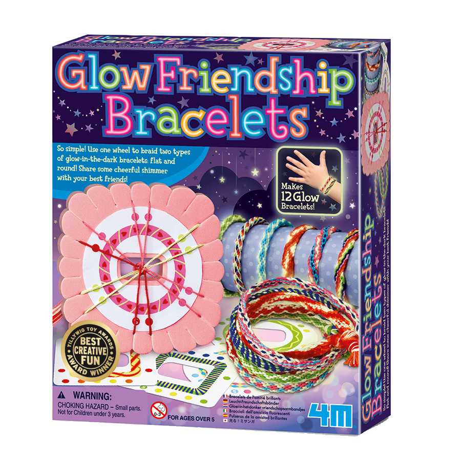 Spark your creativity by making 12 glow-in-the-dark bracelets in flat or round styles on a clever, easy-touse wheel. The kit includes everything you need to stack them up your arm or share the shimmery fun with a friend. Ages 5+